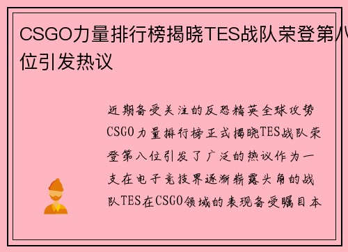 CSGO力量排行榜揭晓TES战队荣登第八位引发热议