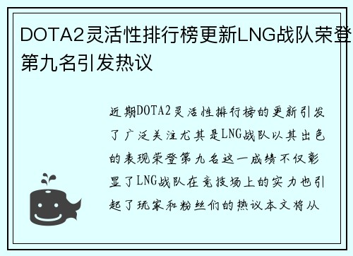 DOTA2灵活性排行榜更新LNG战队荣登第九名引发热议